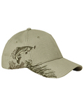 100% brushed cotton twill; Structured front; Pre-curved visor; Hook and Loop backstrap; Detailed embroidered wildlife scene on right side; Dri Duck embossed leather patch left of back vent;